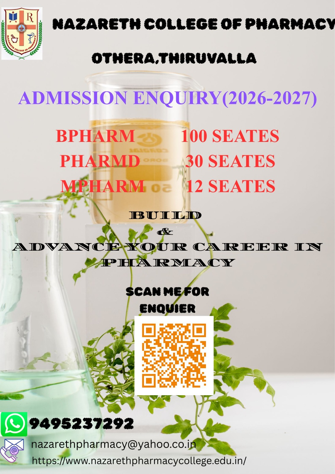 Know moreNazareth College of Pharmacy, Othera, is promoted by Nazareth Ashramam, which is a society under Malankara Suriyani Knanaya Samudayam.